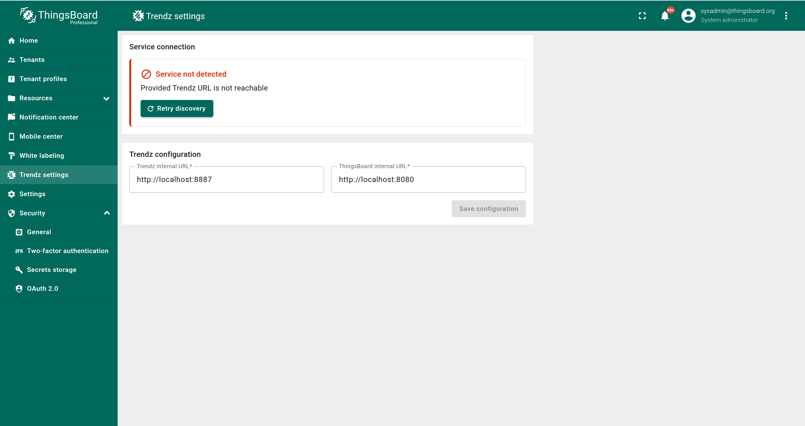 - Retry Discovery - Initiates synchronization with Trendz using the saved configuration.