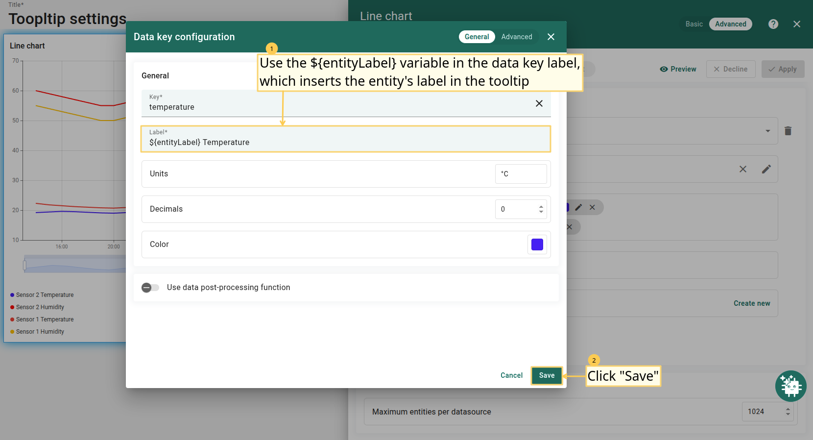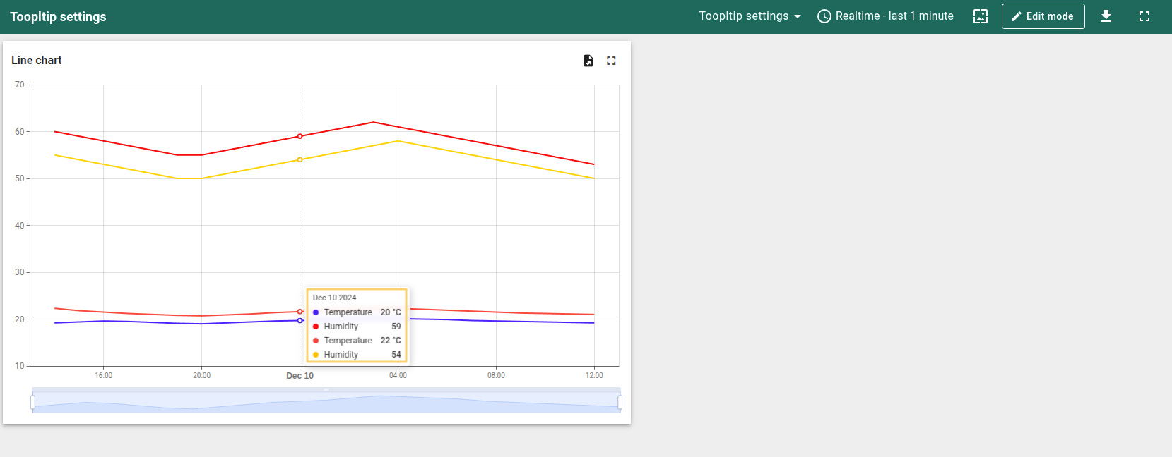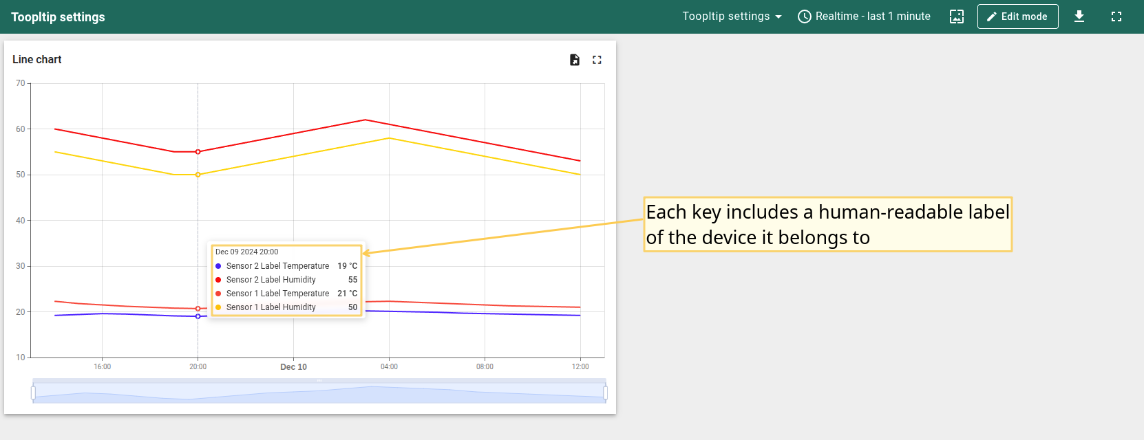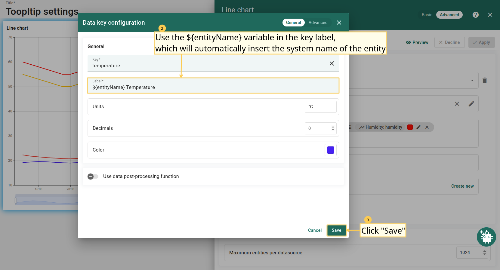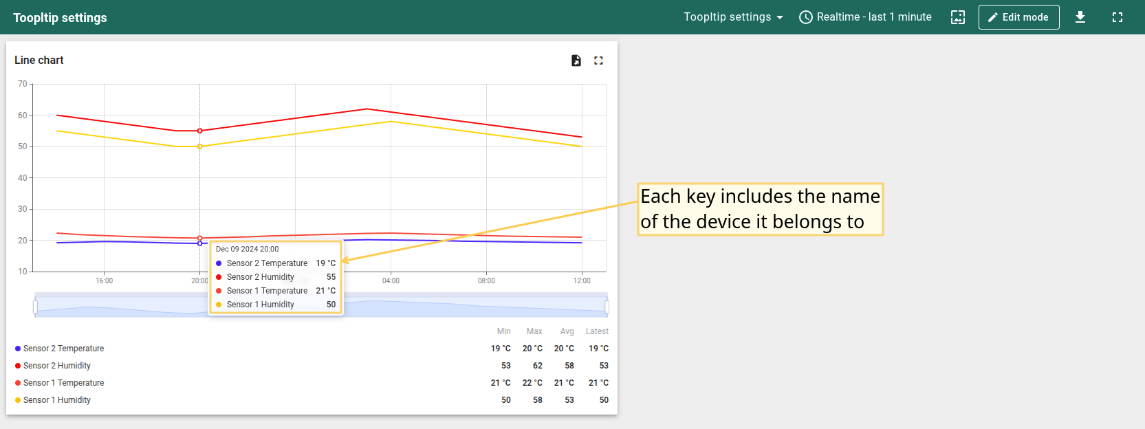 You can customize the values that will be displayed in the tooltip via tooltip settings or Advanced Data key configuration. Tooltip configuration via Settings is basic and applied to all entities at the same time. When configured in the Advanced Data key configuration, it is applied only to the specific time series data, and the basic tooltip function will be overwritten by this configuration.