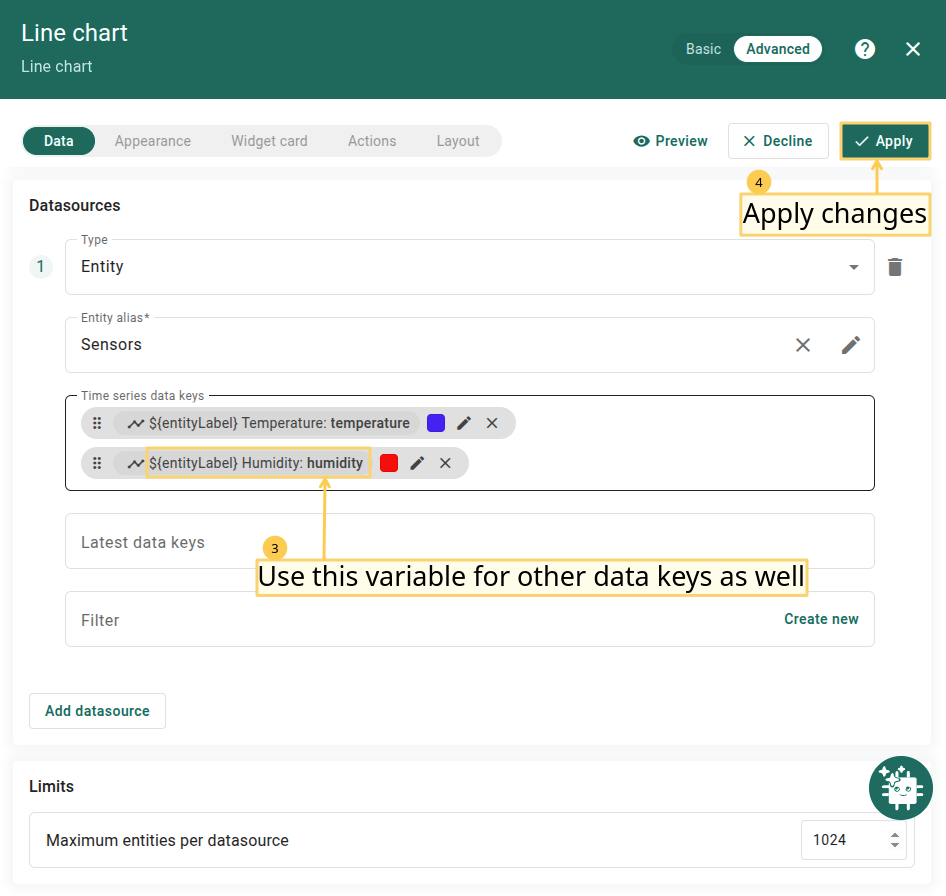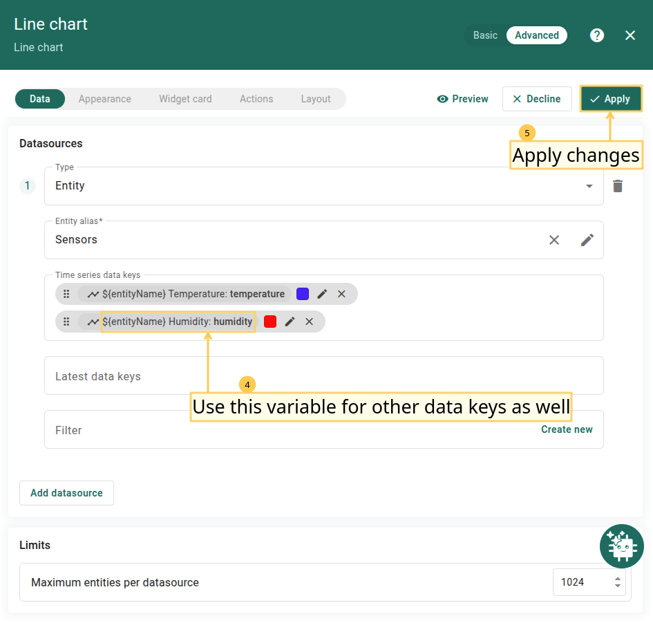 - Enter widget edit mode, specify the data source, add the required data key(s), and apply changes.