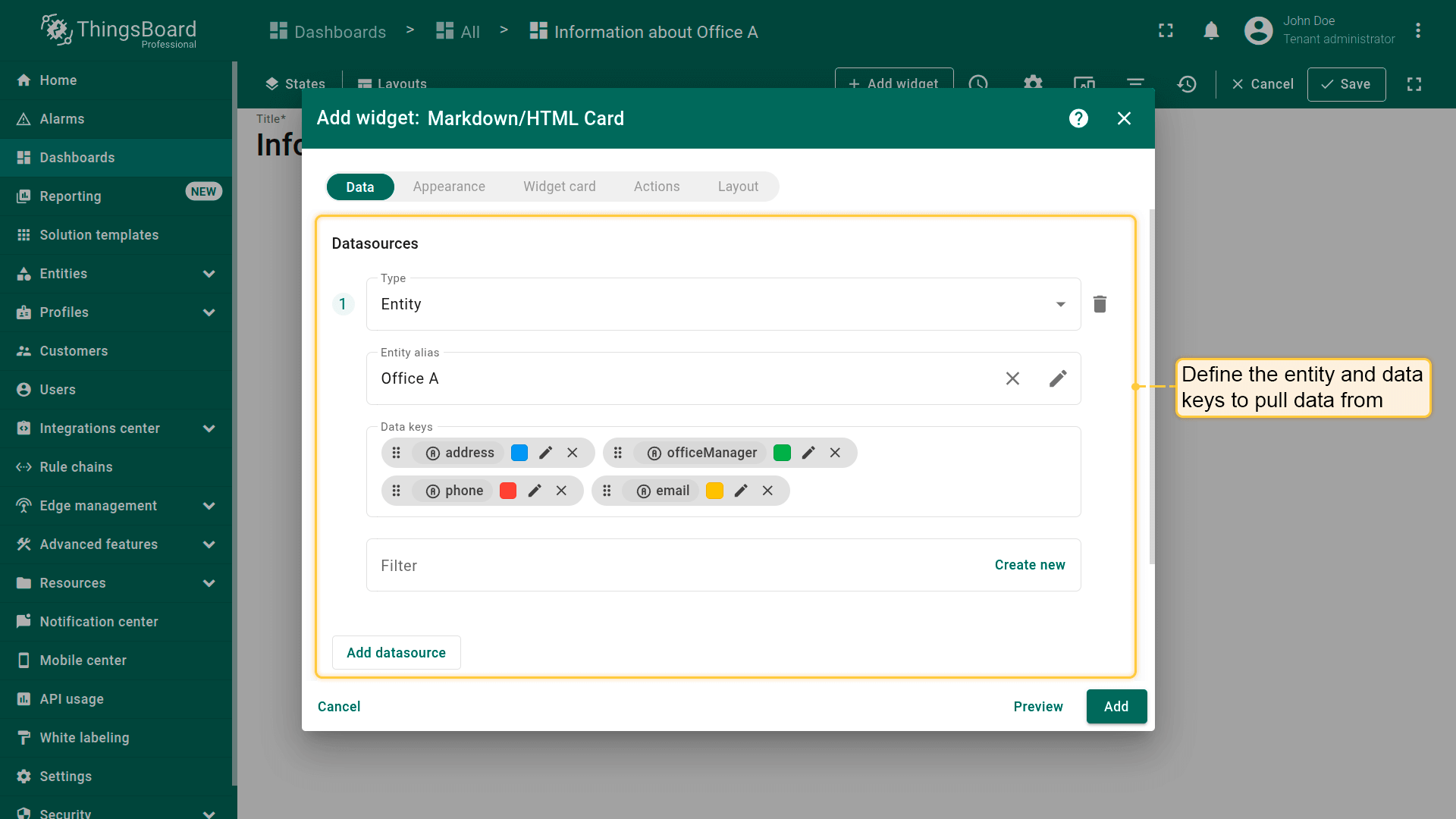 • Optional data. Pull telemetry/attributes via entity alias and data keys to inject values in a template or process them in a value function.