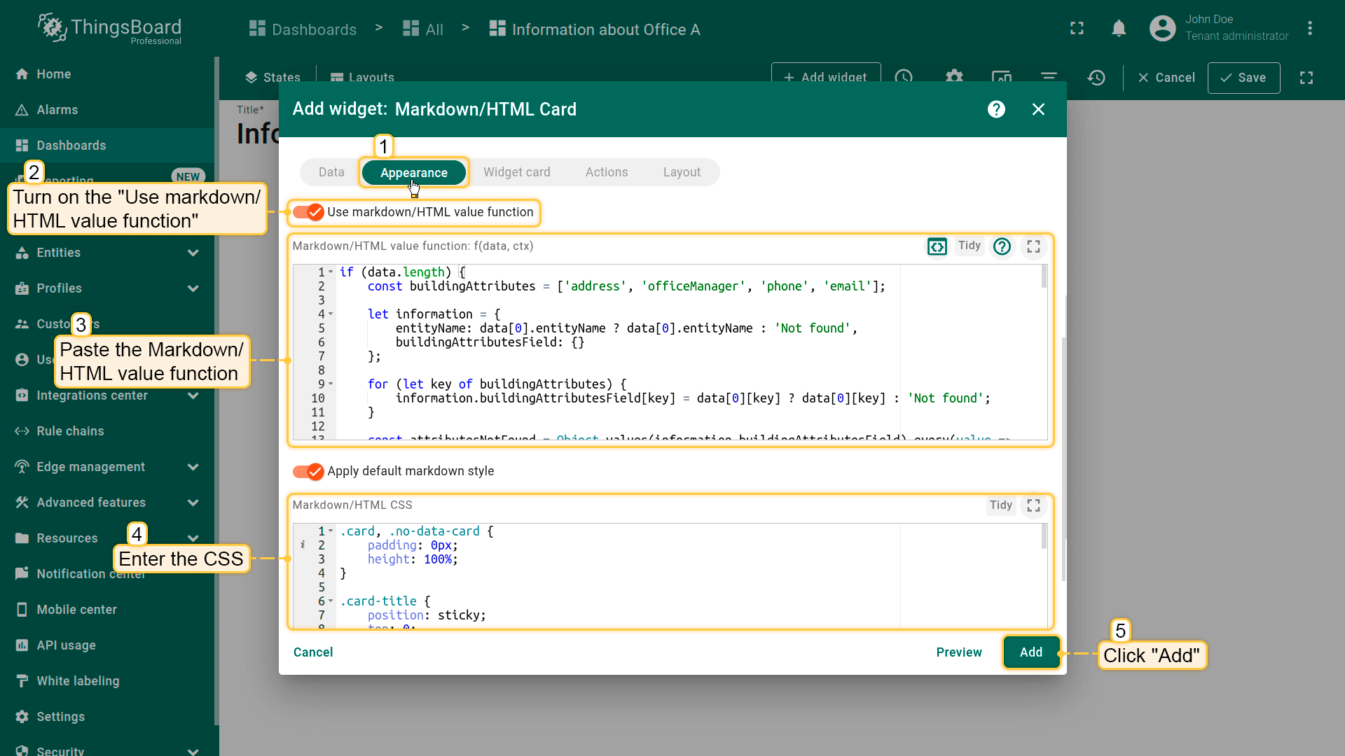 • Choose the Markdown/HTML Card widget from the Cards widget bundle and place it on the dashboard.