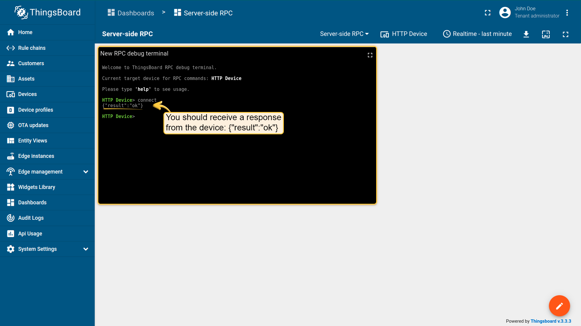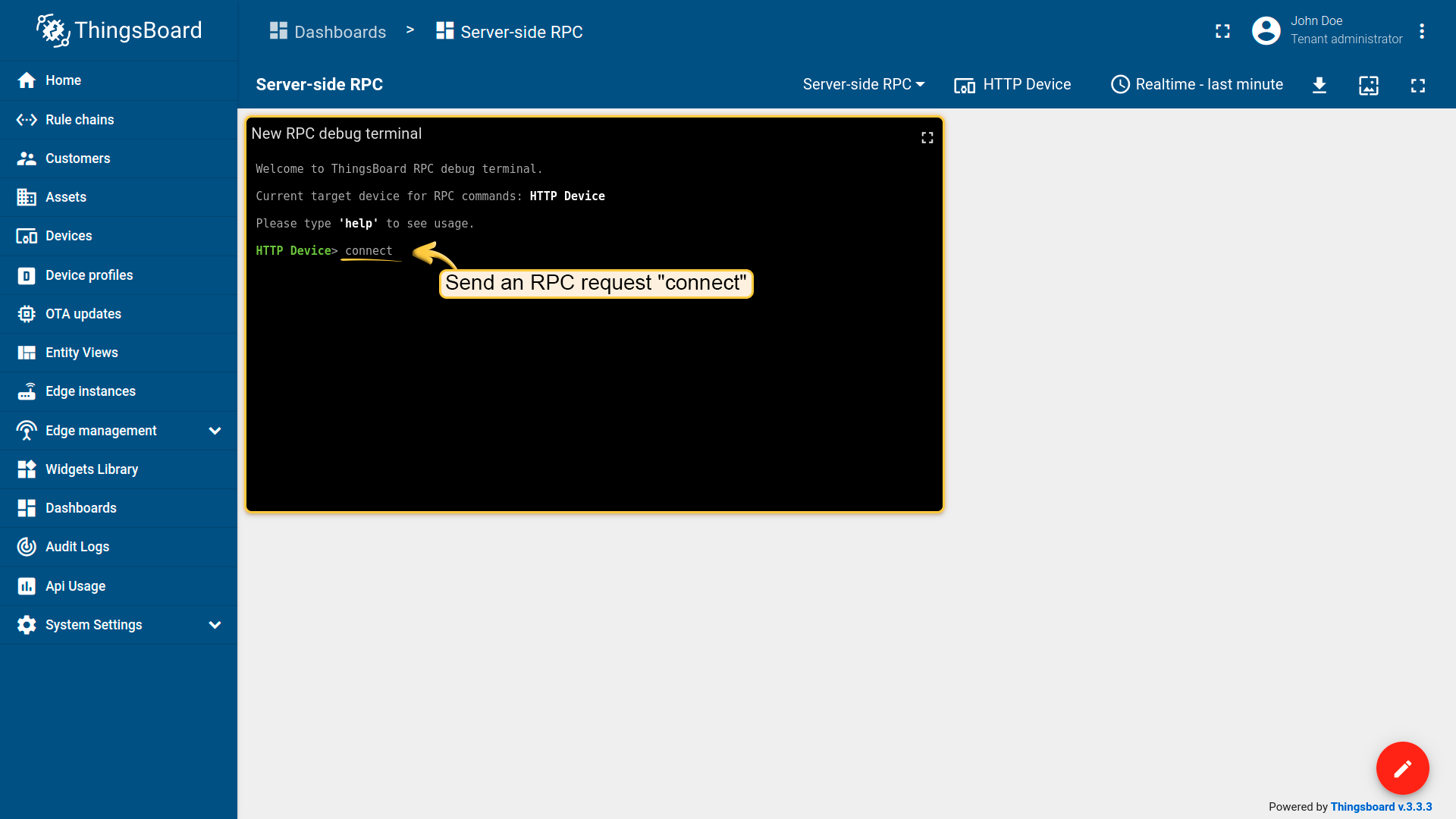 - Send an RPC request “connect” to the device using RPC debug terminal widget;