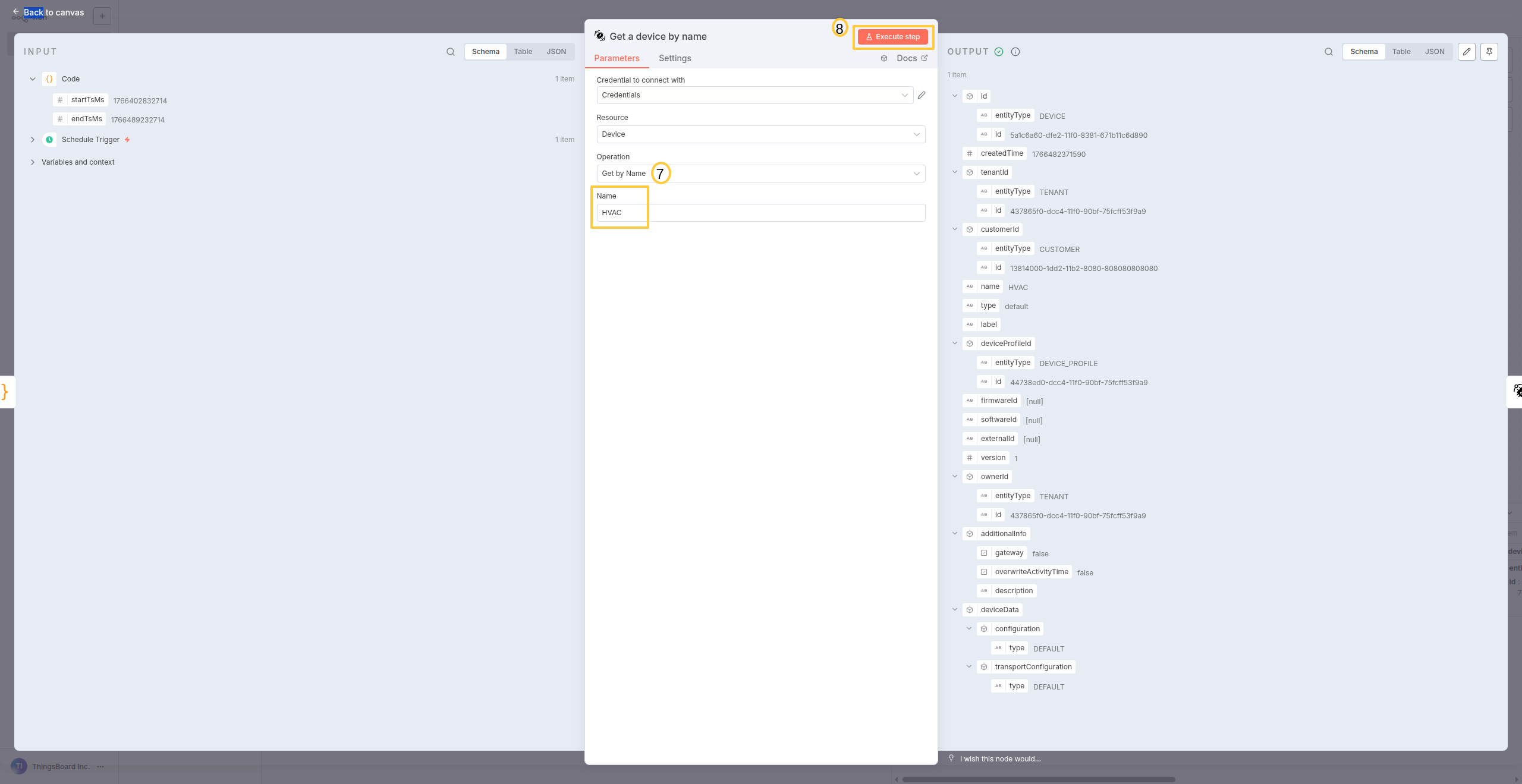 Accepts a device name as input. Finds the corresponding device in ThingsBoard.