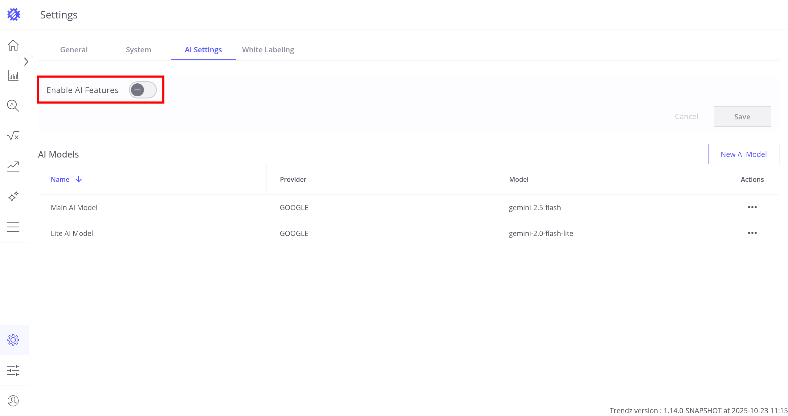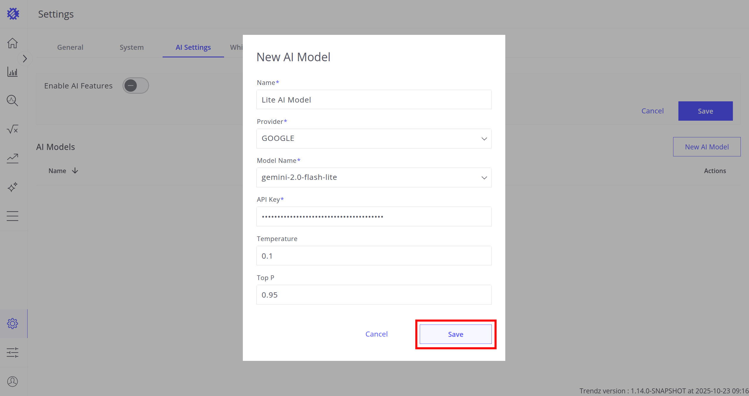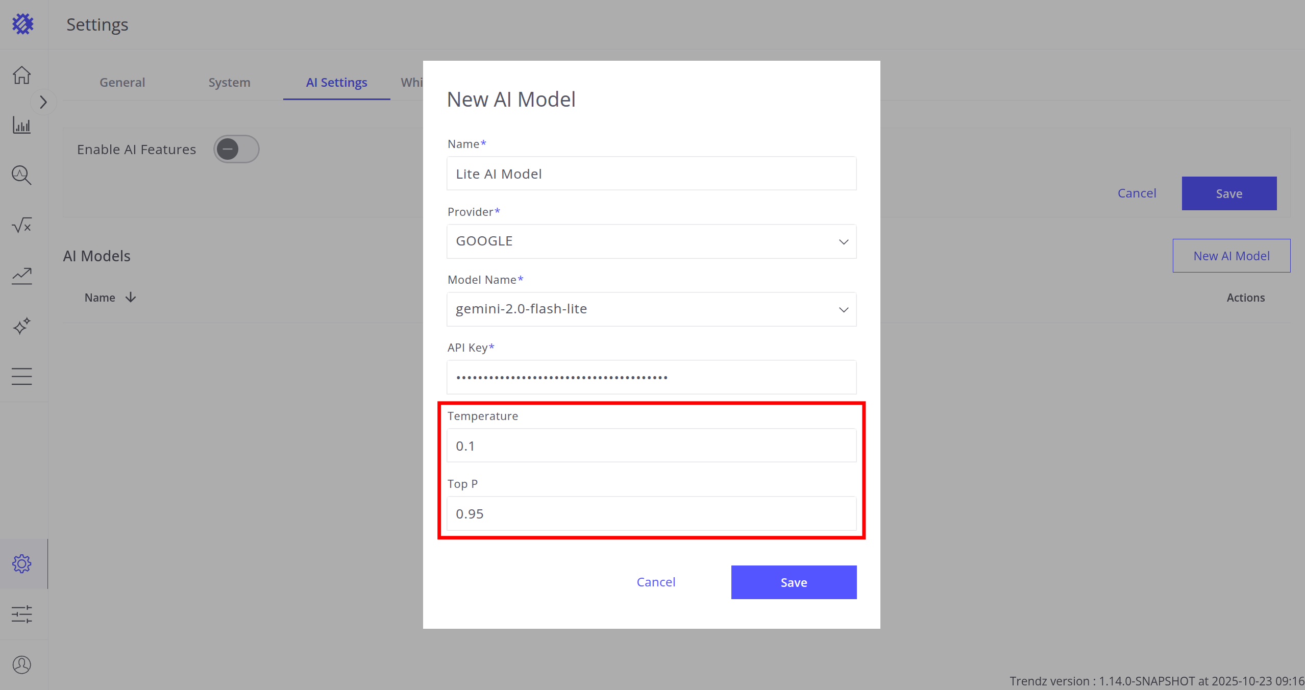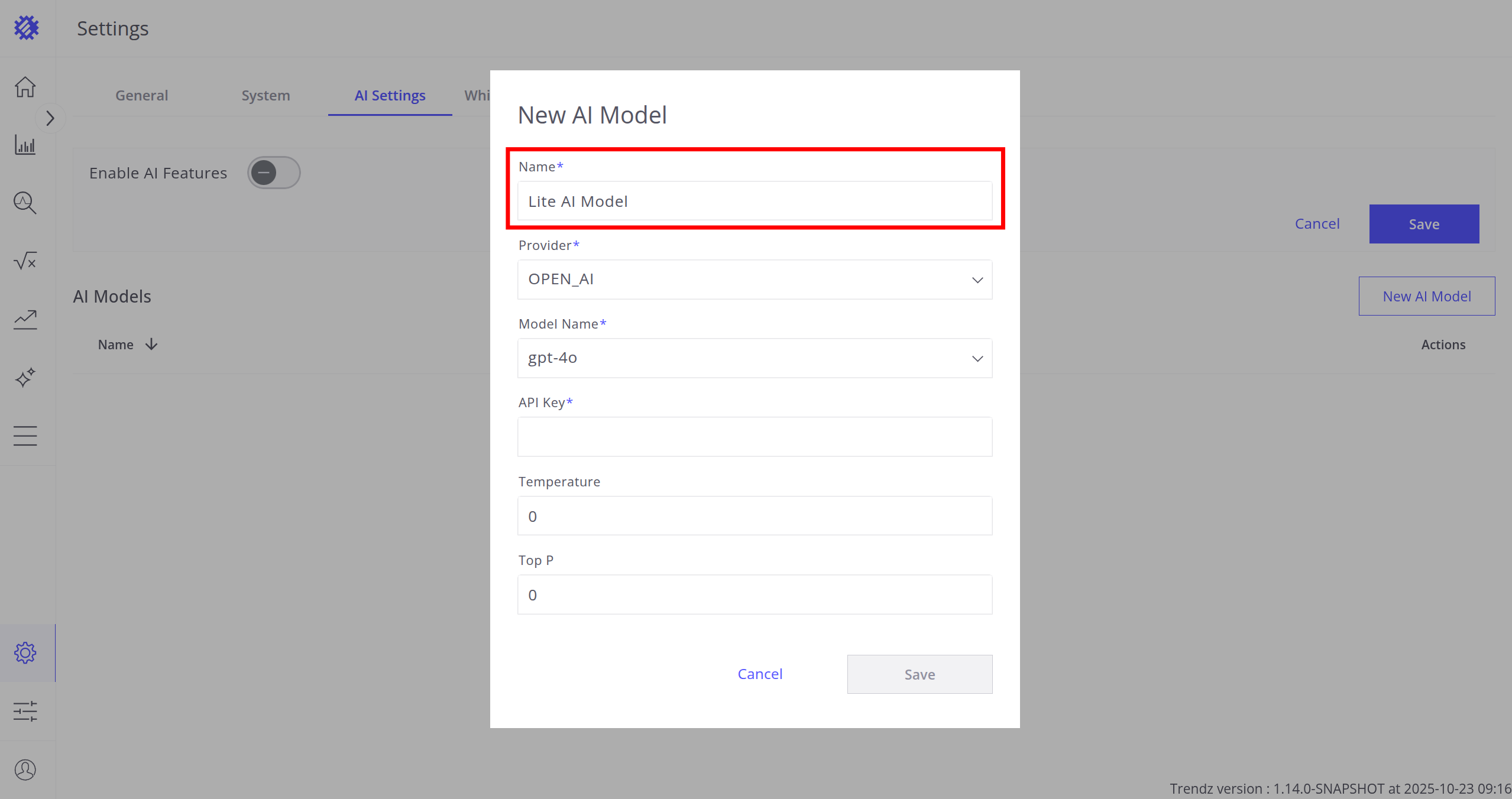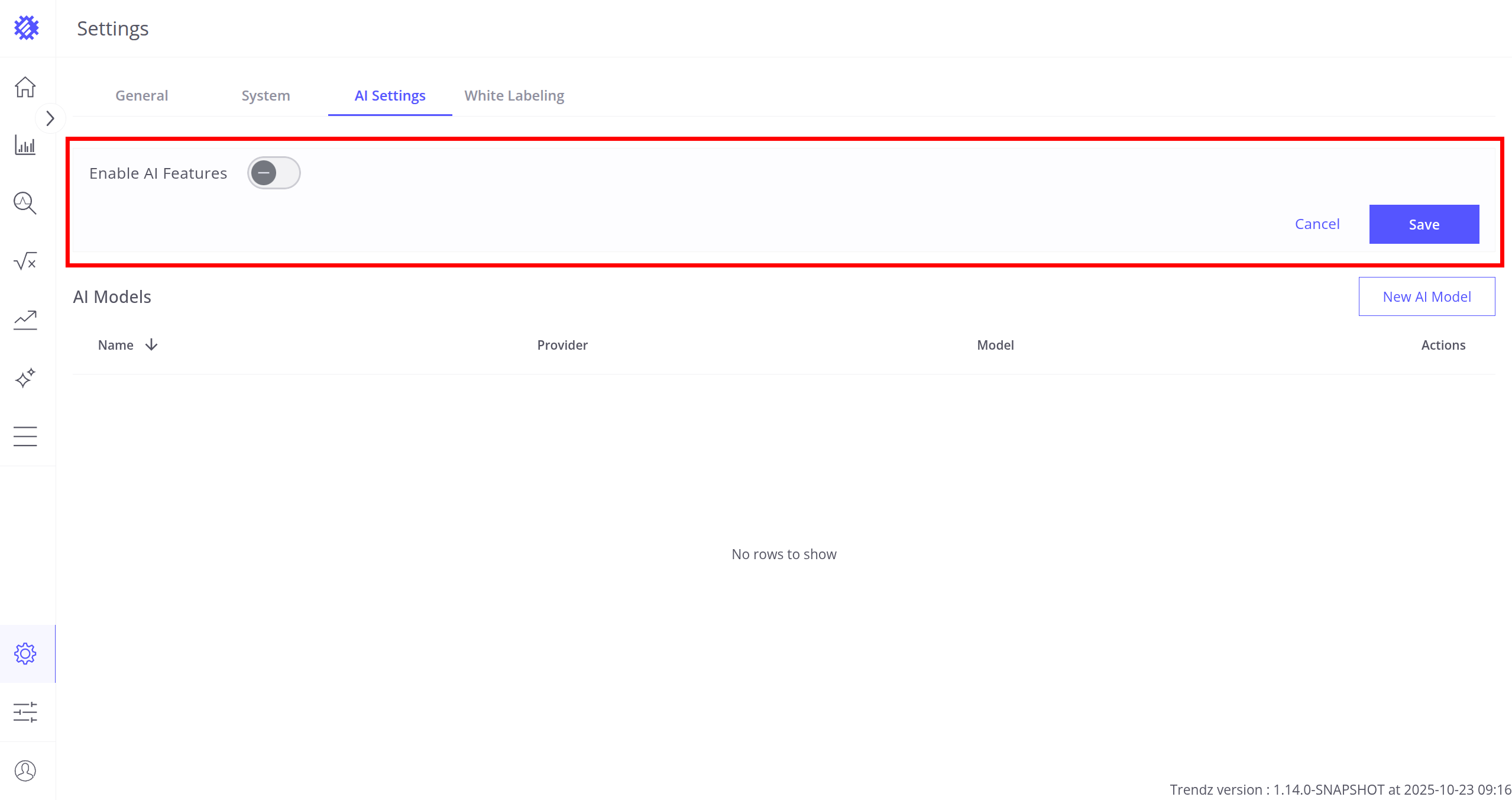 For cloud installations, Trendz provides a default AI model with a limited number of requests available. To extend this request limit or to enable additional AI features, you need to configure the AI Settings section.