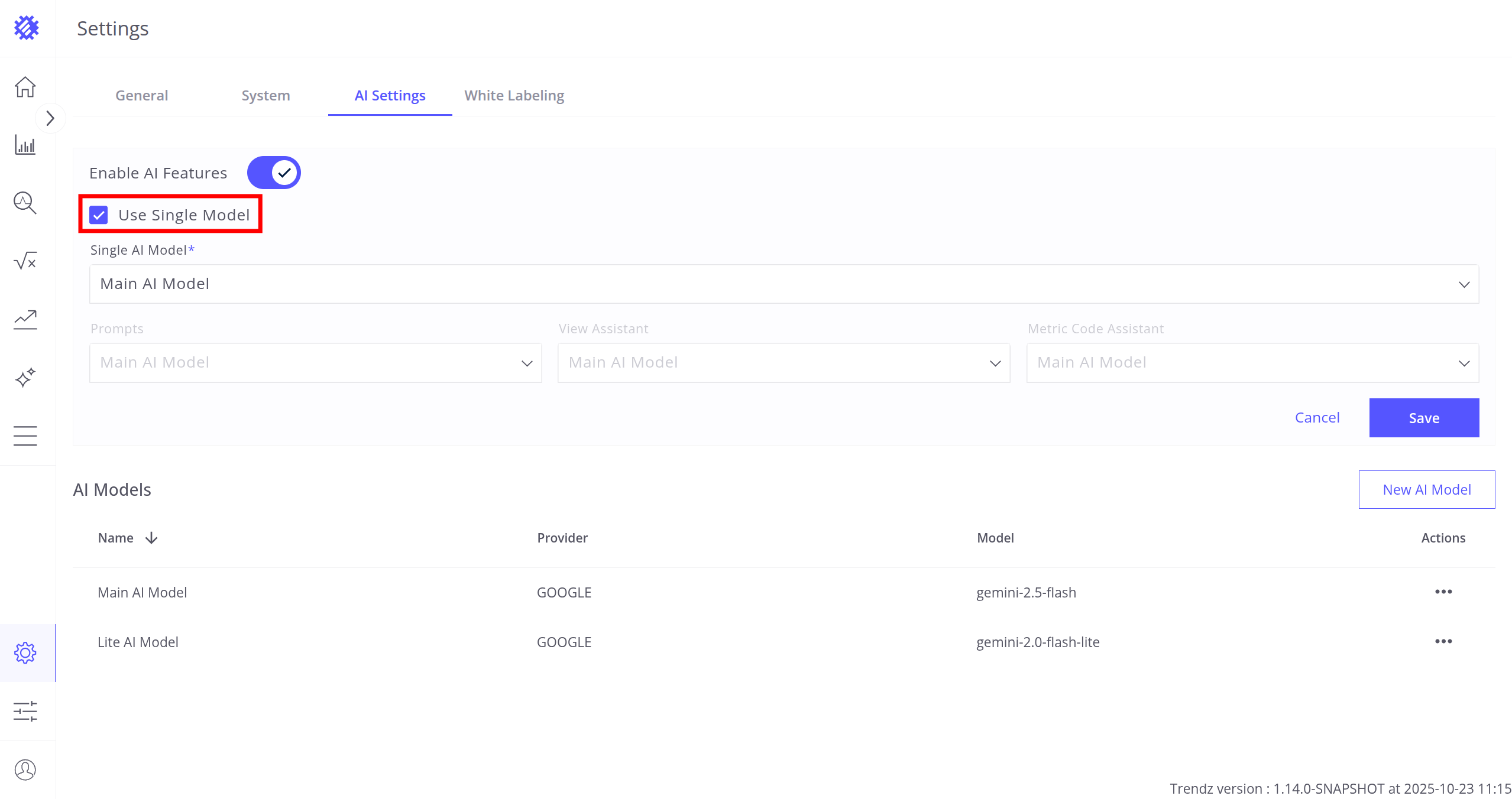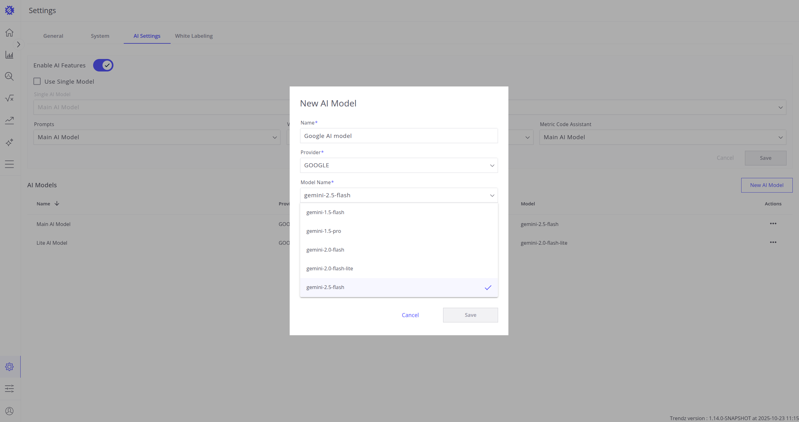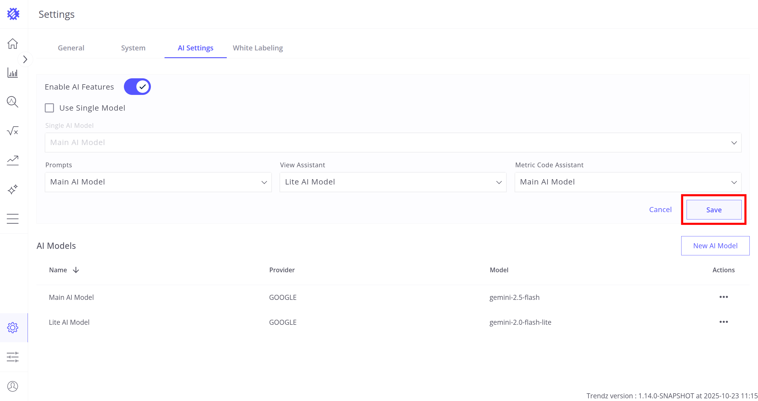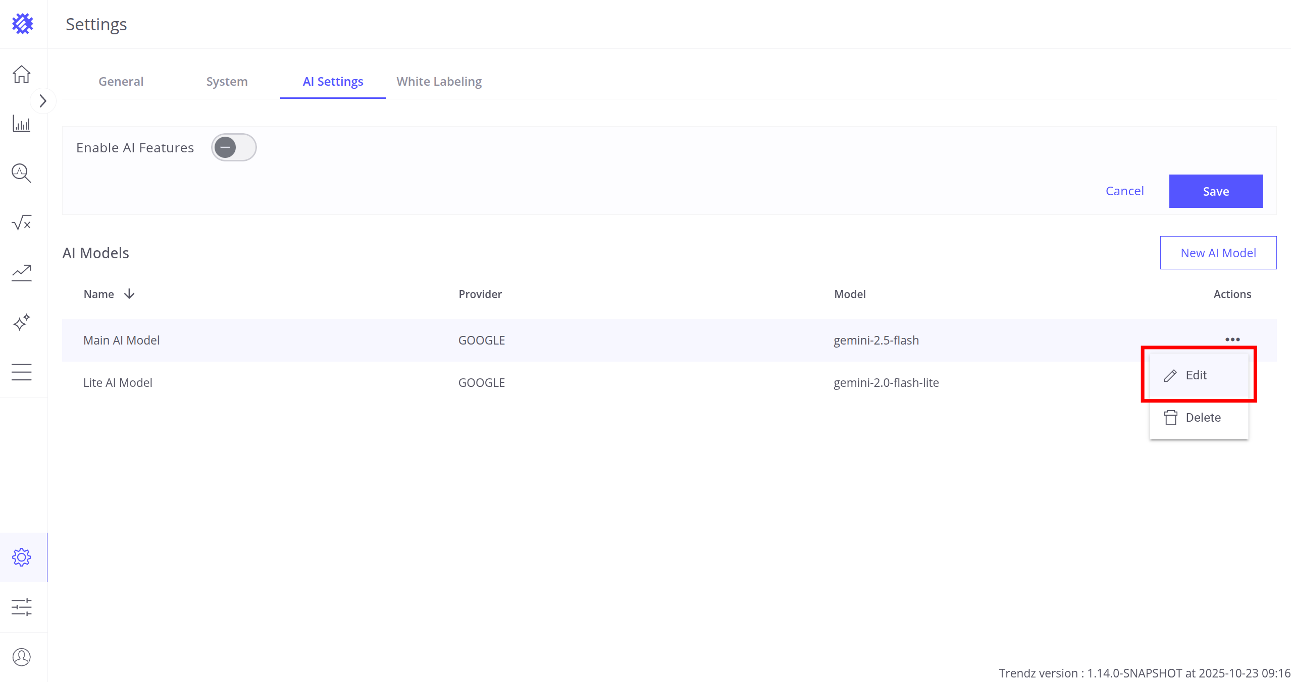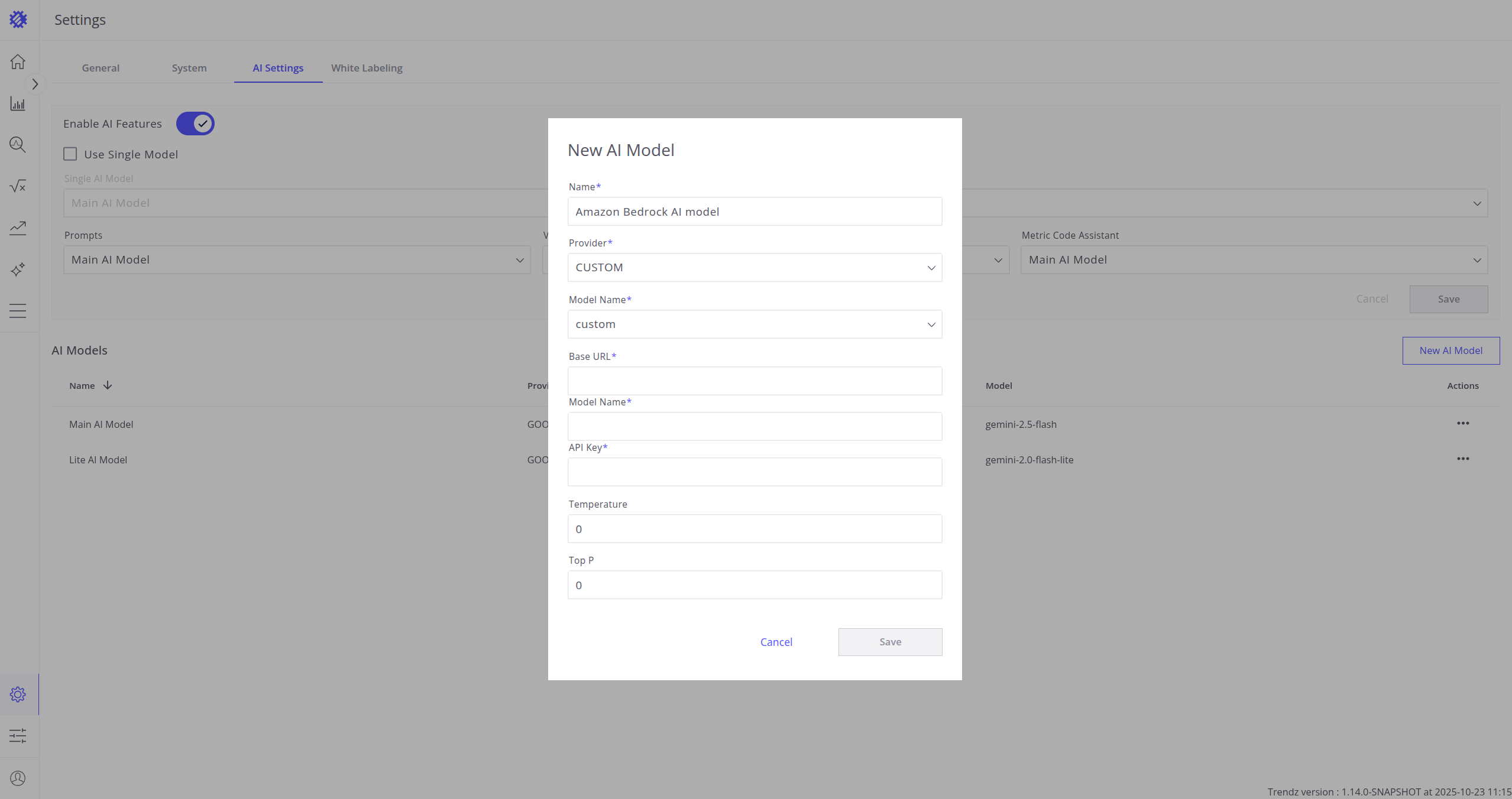 For cloud installations, Trendz provides a default AI model with a limited number of requests available. To extend this request limit or to enable additional AI features, you need to configure the AI Settings section.