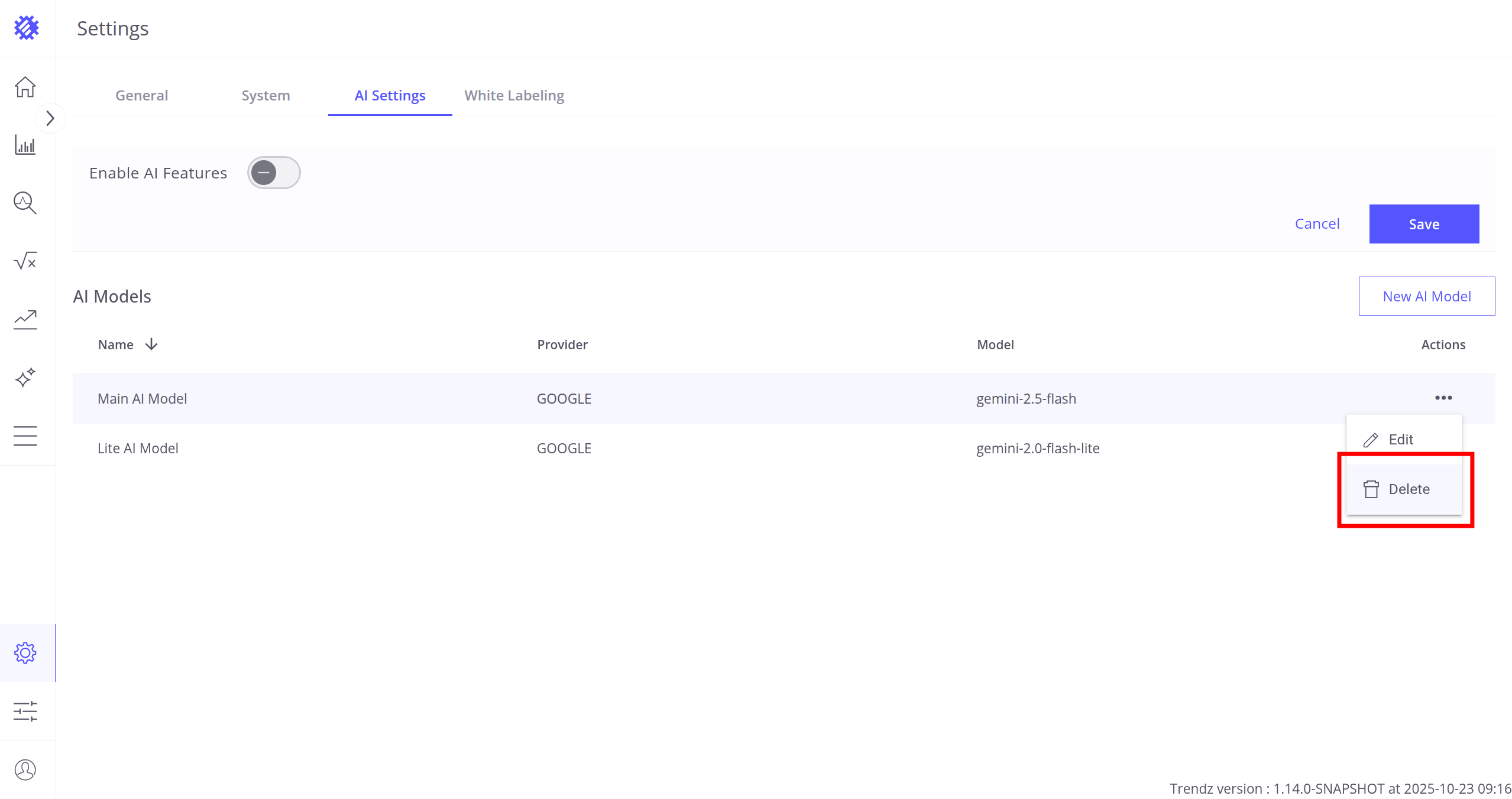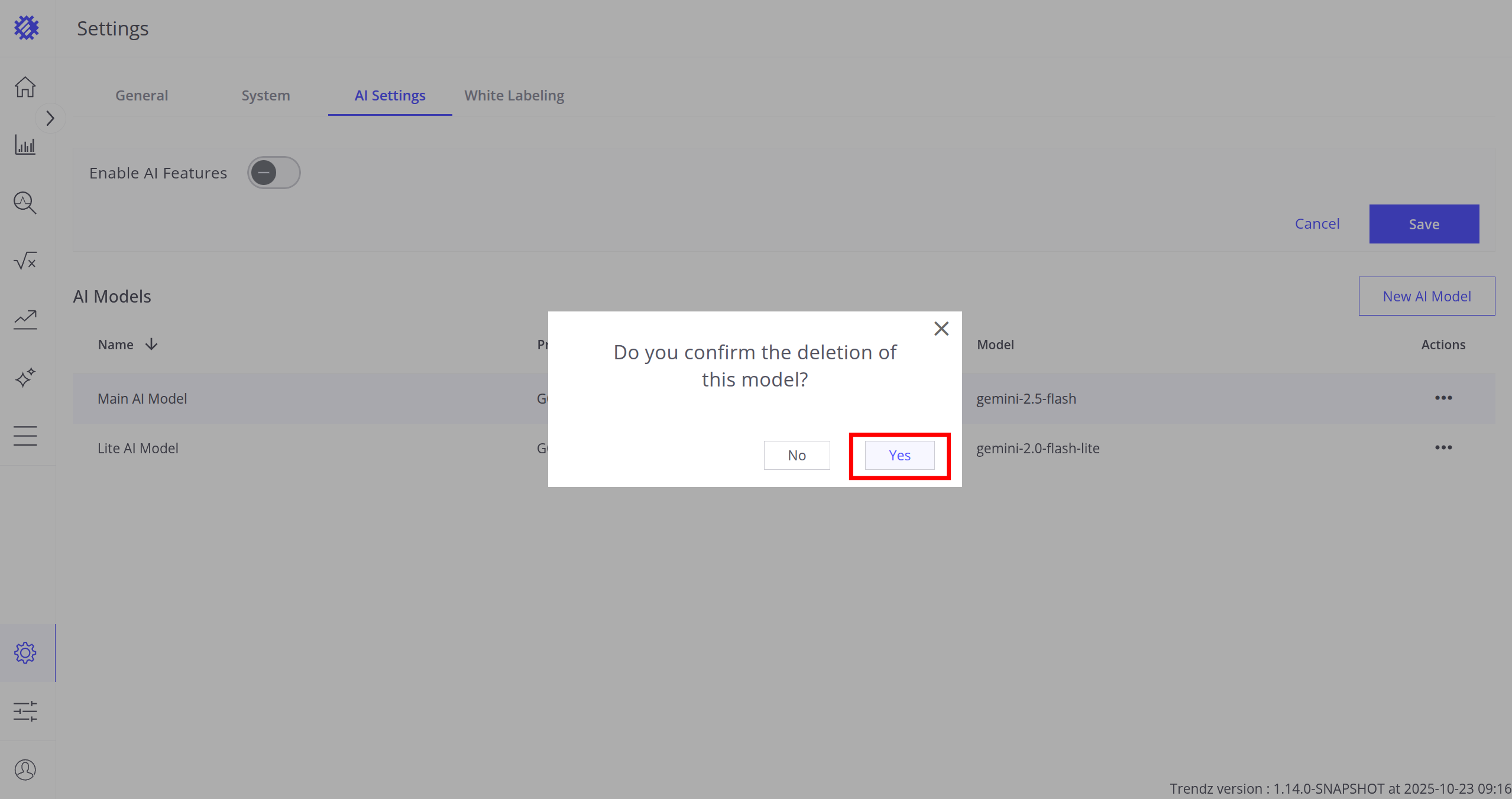 Important: If you delete a model that is already used in AI Features, the feature using this model will be disabled.