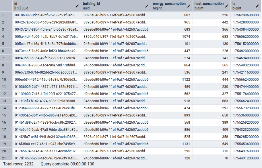 - Enter the table name from which you want to retrieve data (building_consumption). Note: table names are case-sensitive.