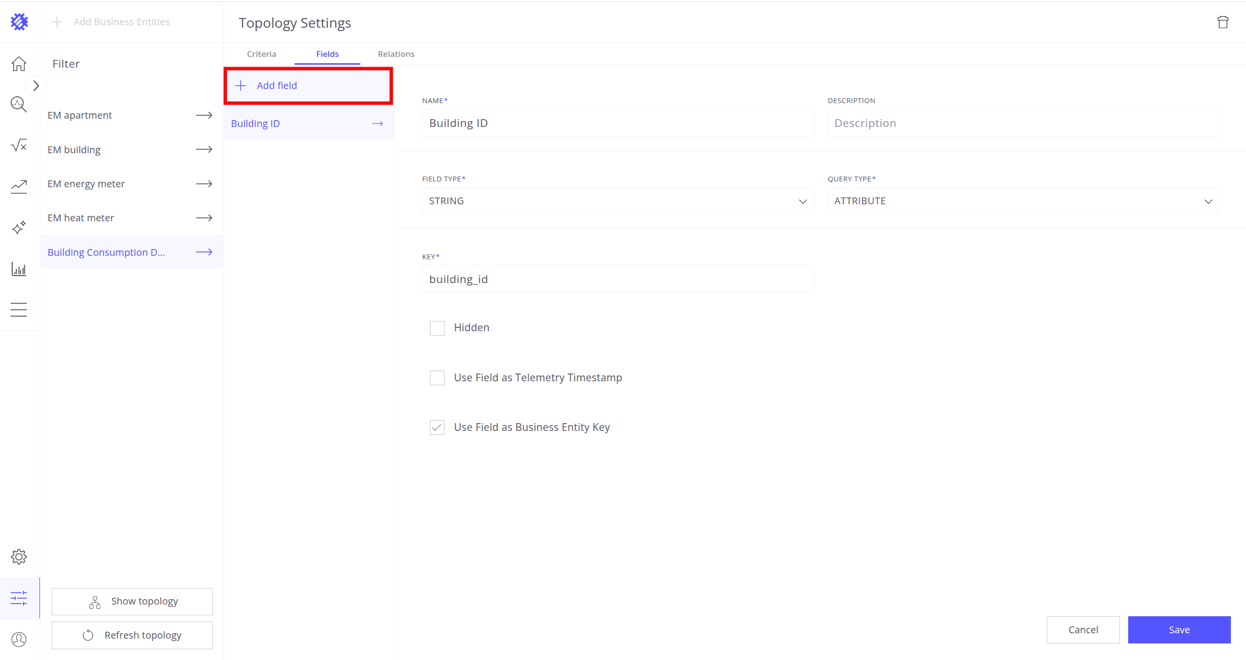 Repeat Step 4 as many times as you need to add columns. To remove the current field, click the delete button in the upper-right corner. You can read more about the business entities tab here.