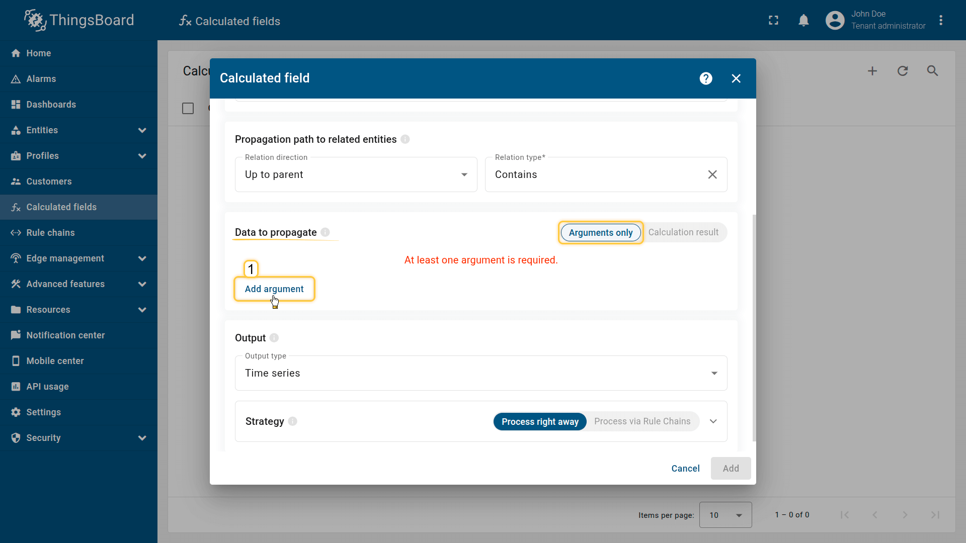 Solution: To force the Calculated Field to apply the new propagation path settings, the system requires a configuration change to the Data to propagate section. Any modification to the arguments will trigger the necessary re-initialization.