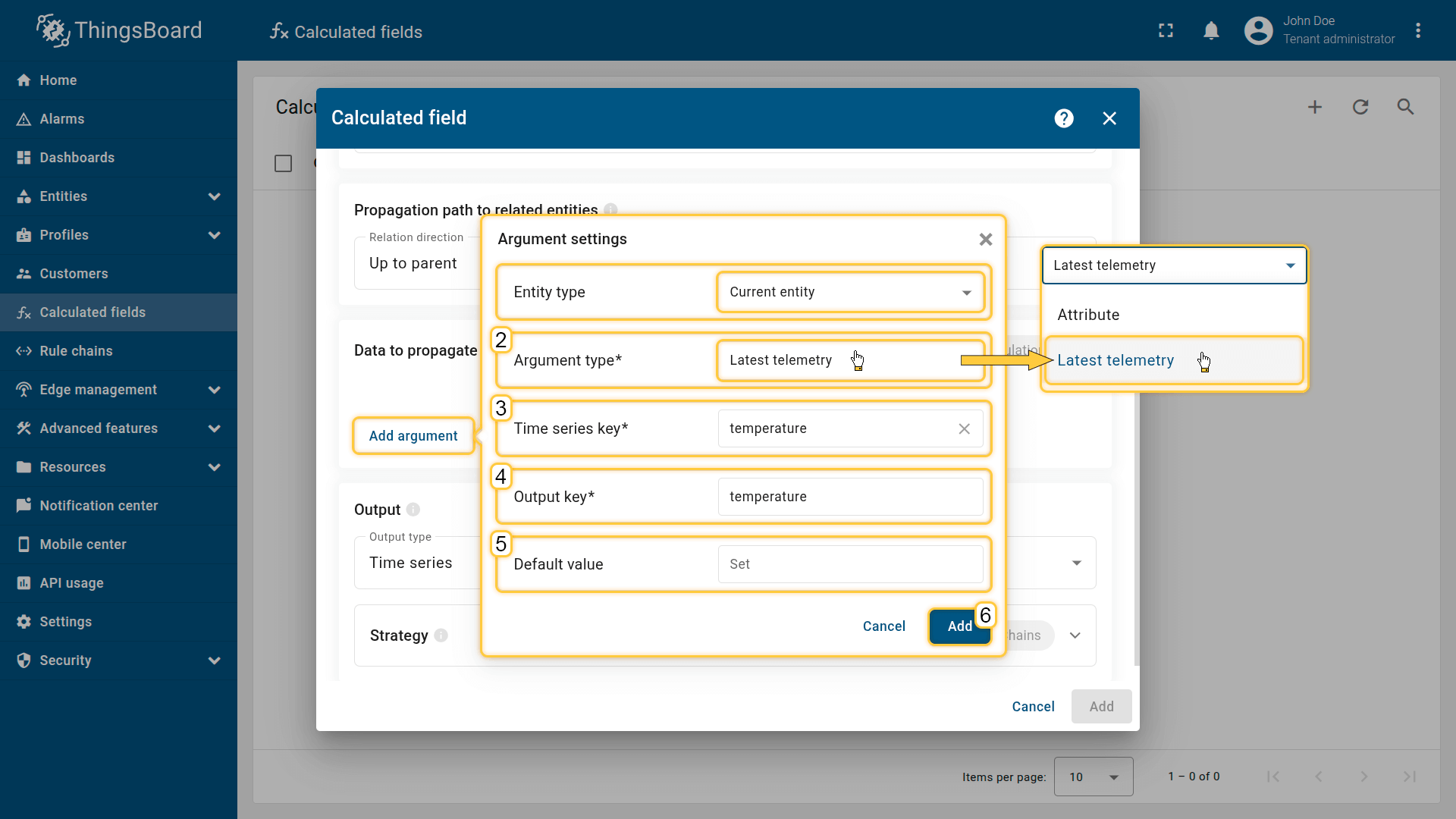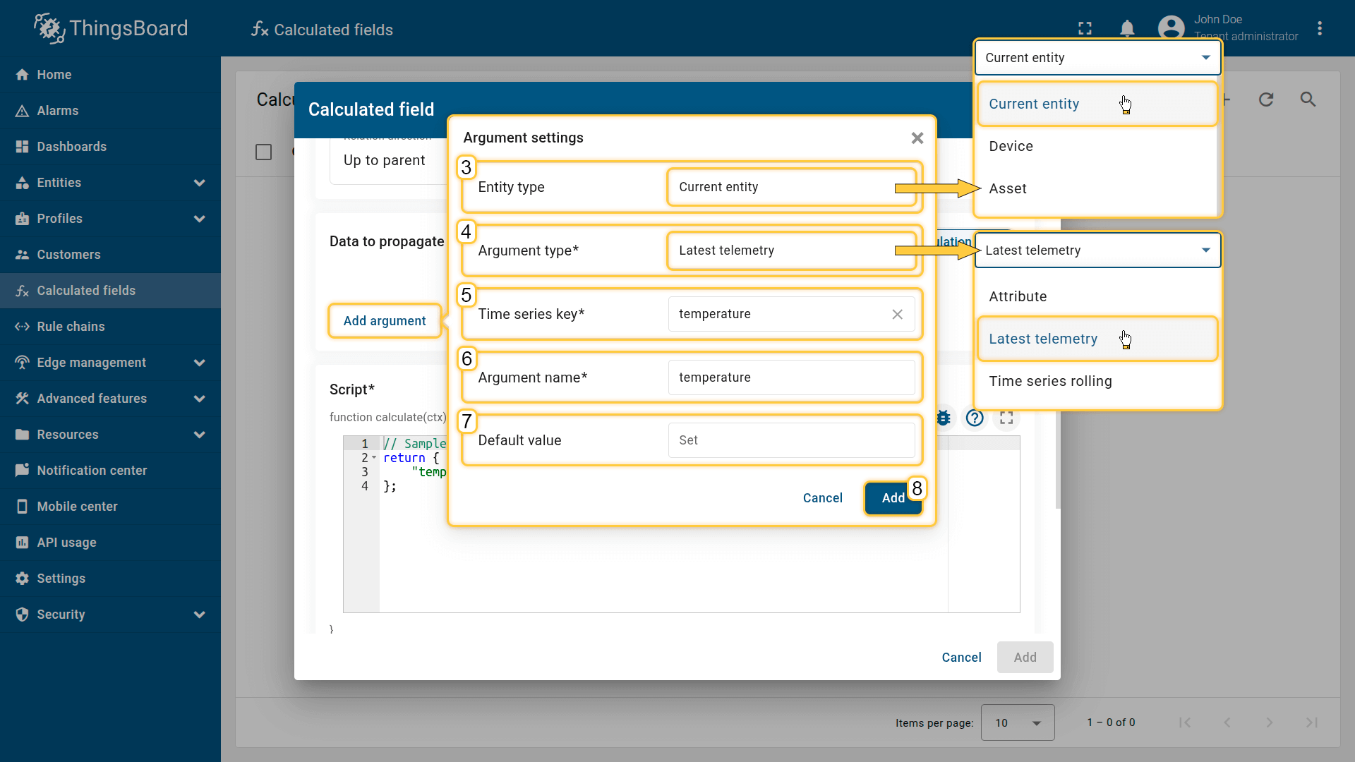 Allows you to compute or transform data (attribute, latest telemetry, or time series rolling) from multiple entities (Current entity / Device / Asset / Customer / Current tenant / Current owner) before propagating it to the related entity.