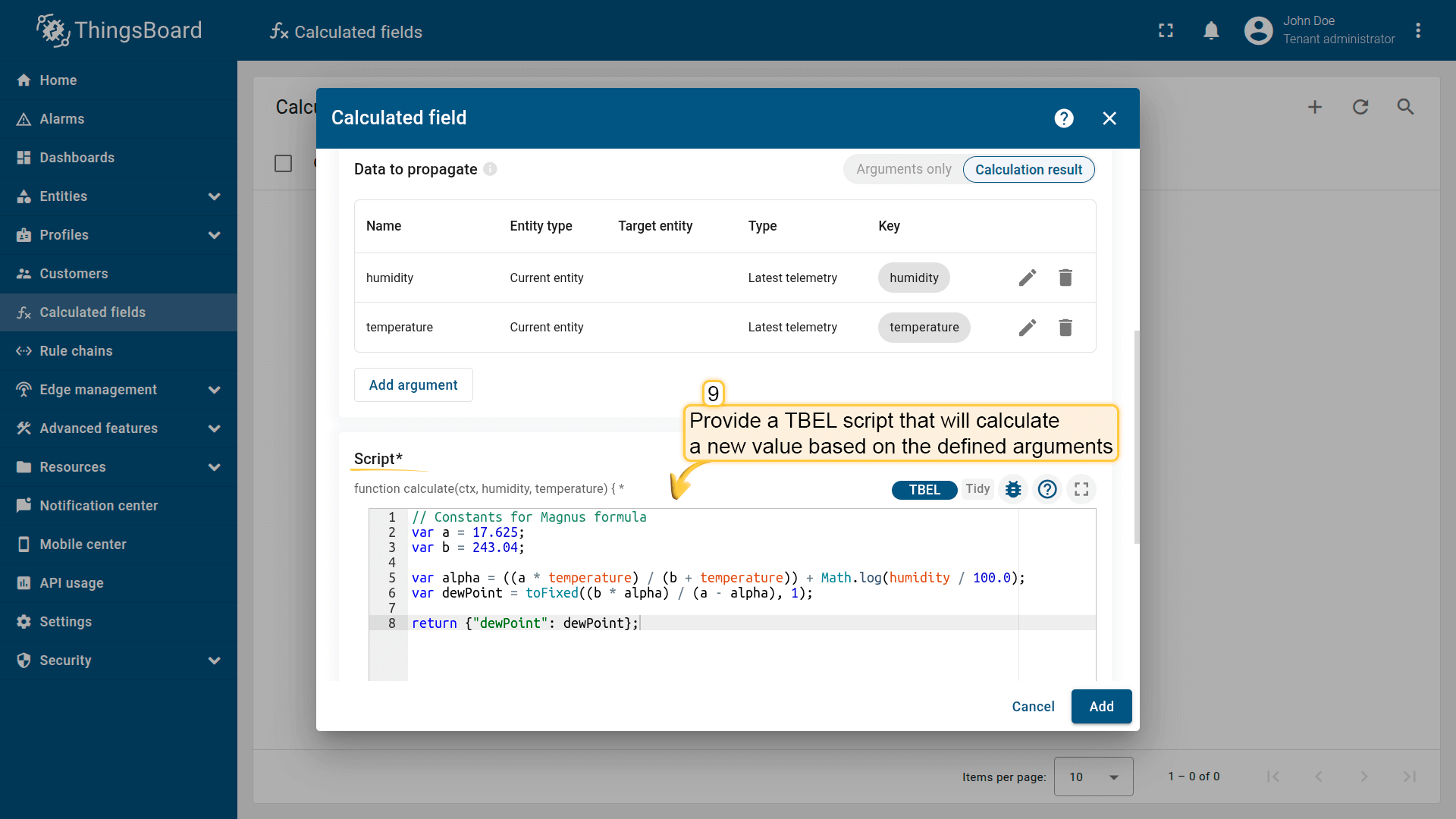 Define the calculation logic using a TBEL function based on the variables configured in Arguments.