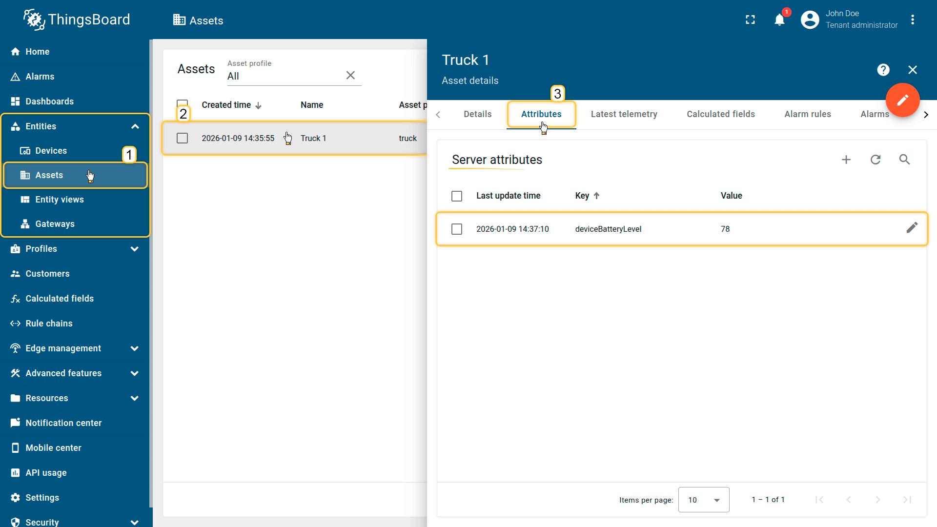 The deviceBatteryLevel attribute is propagated and stored on the Truck 1 asset as a server-side attribute.