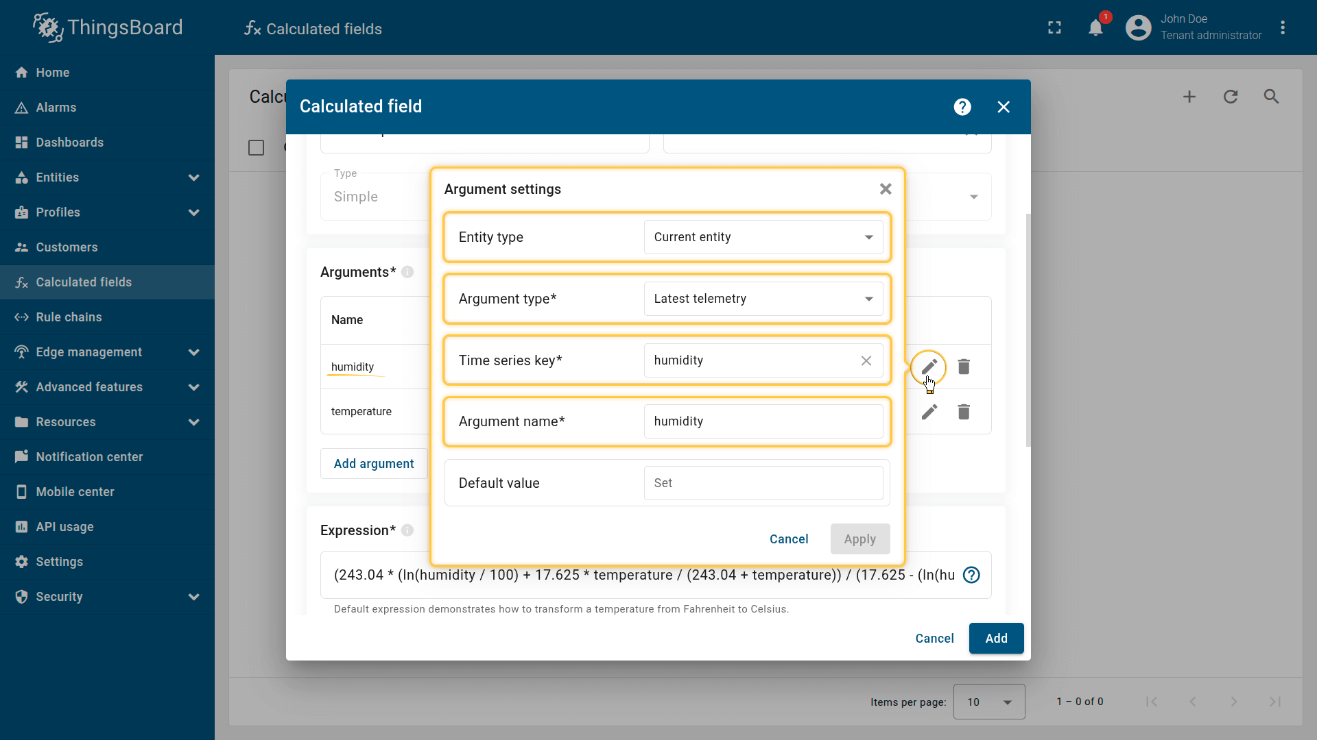 Download the “Dew point calculation” calculated field configuration (JSON).
