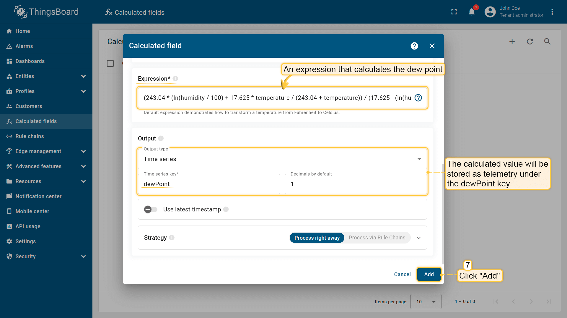 Calculate the dew point and store the result as telemetry under the dewPoint key on the same device.